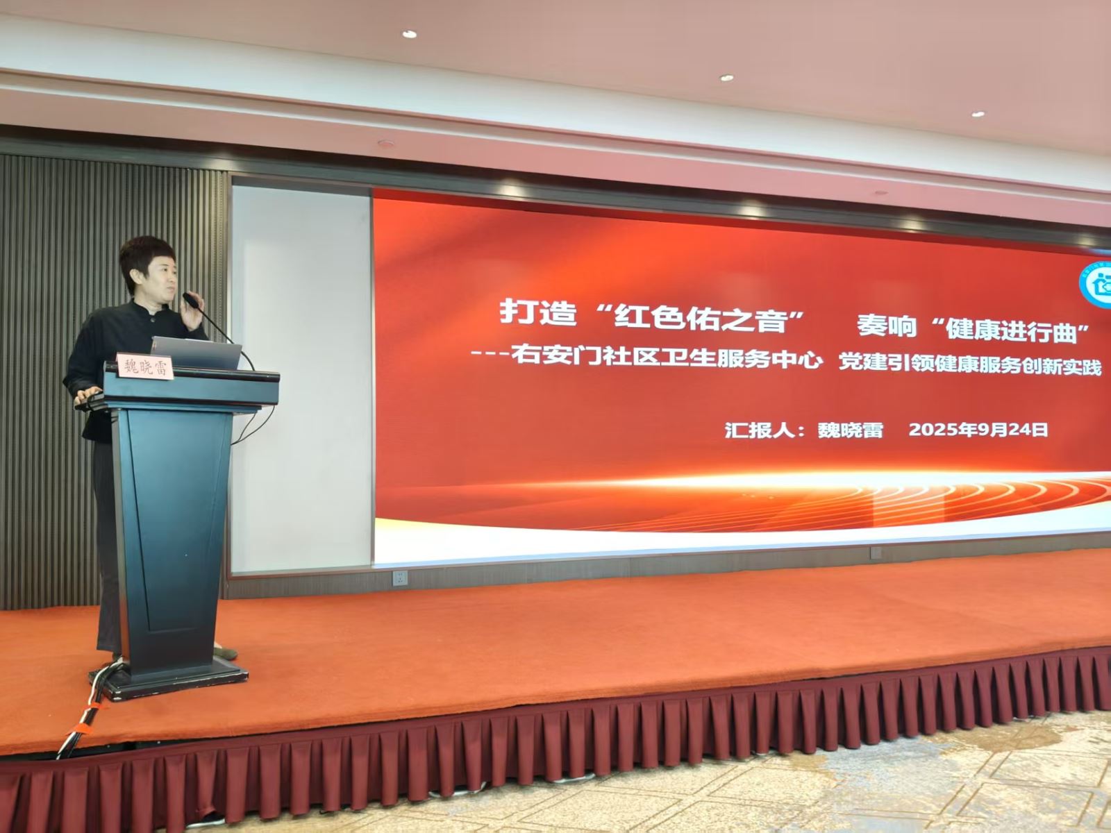 2025年9月24日,北京市健康促进医院“一院一品”优秀案例及工作经验交流分享培训班在北京广西大厦举办。期间,丰台区右安门社区卫生服务中心副主任魏晓雷作为典型案例分享嘉宾,向参会人员系统介绍了中心打造“红色佑之音、奏响健康进行曲”的健康促进特色实践,为基层医疗机构“一院一品”建设提供了可借鉴的“右安门经验”。